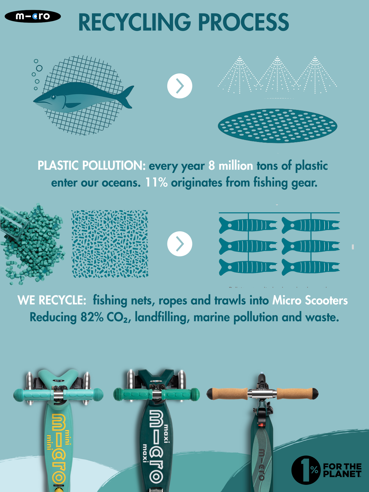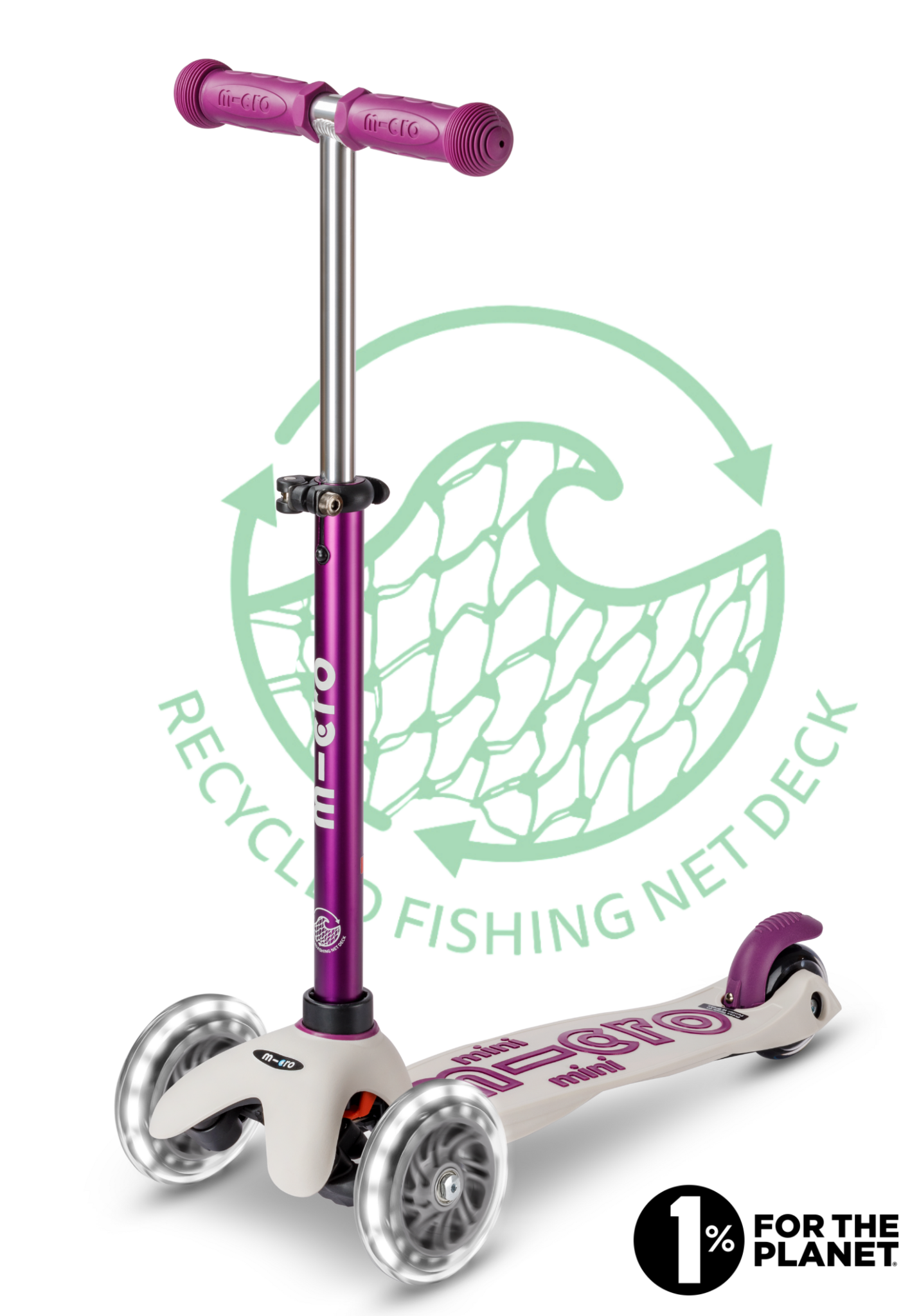 ECO: Het dek en de rem van deze step zijn gemaakt van gerecyclede visnetten. Elk jaar wordt er zo'n 640.000 ton aan visuitrusting in de oceanen achtergelaten. Micro pakt het probleem bij de bron aan en zamelt oude netten direct in bij de vissers. Het materiaal wordt gerecycled en hergebruikt voor onze duurzame ECO steps. Daarnaast doneert Micro 1% van de verkoop van de ECO-lijn aan milieuorganisaties.